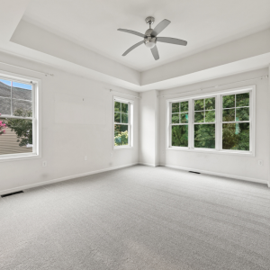 - Main-level primary suite with tray ceiling, en-suite bath, and walk-in closet