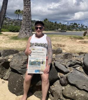 Roo on Uke, a local musician known all over the Cape Region, enjoyed a four-day ukelele retreat while on a recent trip to Hawaii. Roo on Uke is shown here during his 10-day stay at The Kahala Hotel and Resort, reading the latest copy of the Cape Gazette.