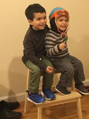 As for the grandchildren, Peter insisted on leaving his winter hat on all day. Aiden spent dinner, announcing (repeatedly), “I ate your uncle!” Steve was in a musical, and one of the lines in a song he’d been practicing at home was “I ain’t your uncle.” Mystery solved! The boys were perfectly content without extra playthings, as long as they were being pushed around the apartment in Gil’s rolling desk chair, and could look out the window at the bustling Brooklyn street scene, five floors below.