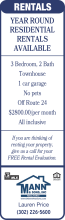 - Furnished/equipped. Washer/dryer. Spacious apartment, sleeps 4. Private entrance/parking. Separate behind residence. All utilities included. Walk downtown Lewes. $2,000/month. (302) 853-0789.