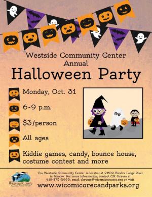 The party, for all ages, will include kiddie games, candy, a bounce house, a costume contest and more. Admission is $3 per person and the party runs from 6-9 p.m. on Halloween at the Westside Community Center.