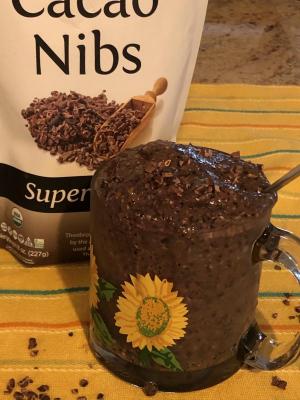 This morning I needed my RBG BREAKFAST—Rolled Oats, Banana/Berry, Greens(handful or more each). A few more ingredients made it positively divine—Cacao Nibs, chia seeds, and fresh ginger slice( 1 tablespoon each). The ripe banana chunks (1 banana/person) had been frozen for 24 hours. I started with 1/4 cup of cider (water, plant milk, juice) added to everything in the food processor. It was so thick that I needed a spoon.