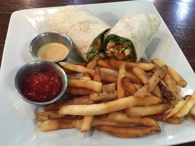 $10 Thai Wrap with Chicken, Veggie Slaw and Ginger Sauce, served with fries