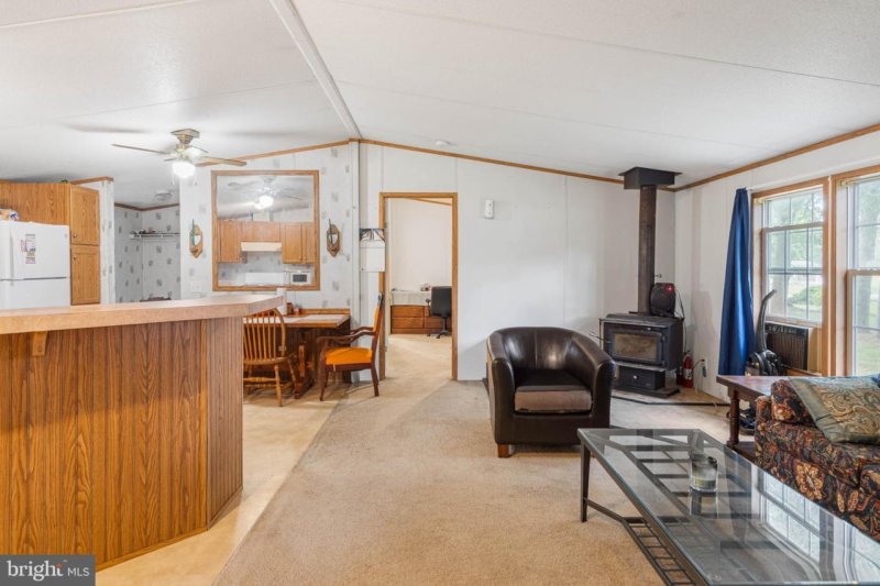 Step inside to an open and inviting layout, where the kitchen provides generous cabinet space and durable vinyl flooring that flows seamlessly into the dining area—perfect for everyday meals and entertaining. The cozy living room features a woodstove that adds warmth and charm during cooler months.