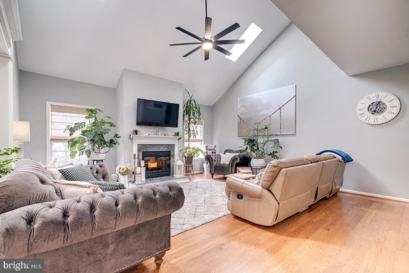 Inside, the foyer is flanked by a private den or home office on one side and a formal dining room on the other, highlighted by an elegant chandelier that makes entertaining feel effortless. The heart of the home is the expansive living room, where vaulted ceilings, skylights, and a gas fireplace create a bright and inviting gathering space.