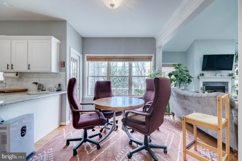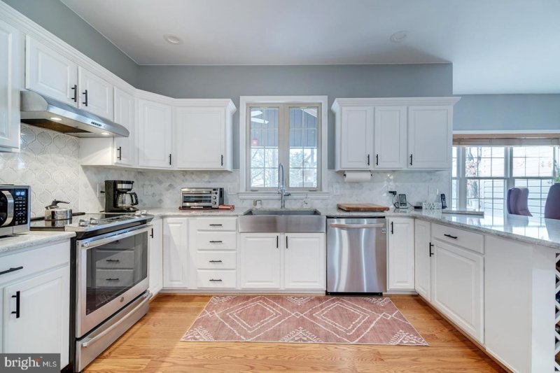 Just off the living room, the breakfast nook provides a casual dining option and opens directly to the rear deck, offering seamless indoor-outdoor flow. The kitchen is tastefully finished with white cabinetry, light granite countertops, a farmhouse sink, and stainless steel appliances, balancing timeless style with everyday functionality. A nearby laundry and mudroom with exterior access adds convenience, while a powder room is tucked neatly into the main hallway.