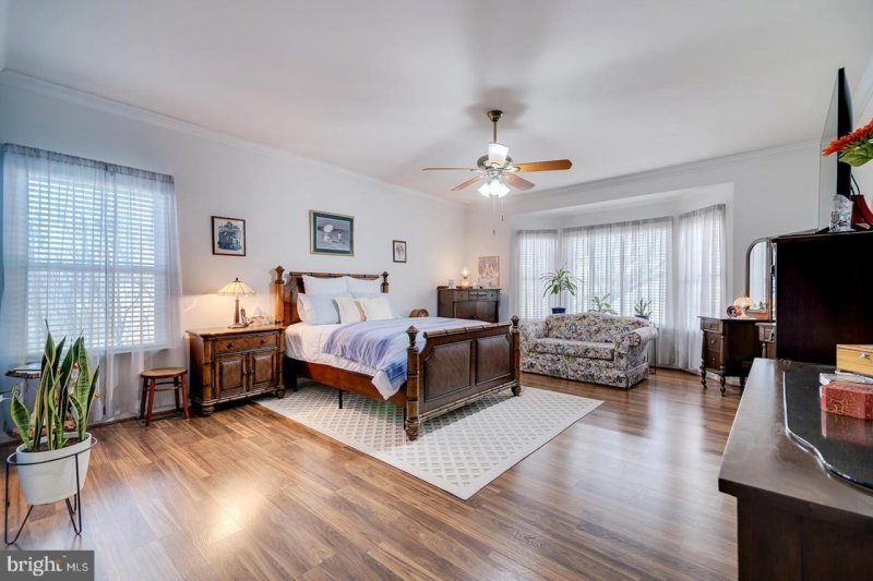 The main-level primary suite serves as a true retreat, featuring a bay window, ceiling fan, two walk-in closets, and a well-appointed ensuite bathroom with double vanities, a soaking tub, a step-in shower, and a linen closet.