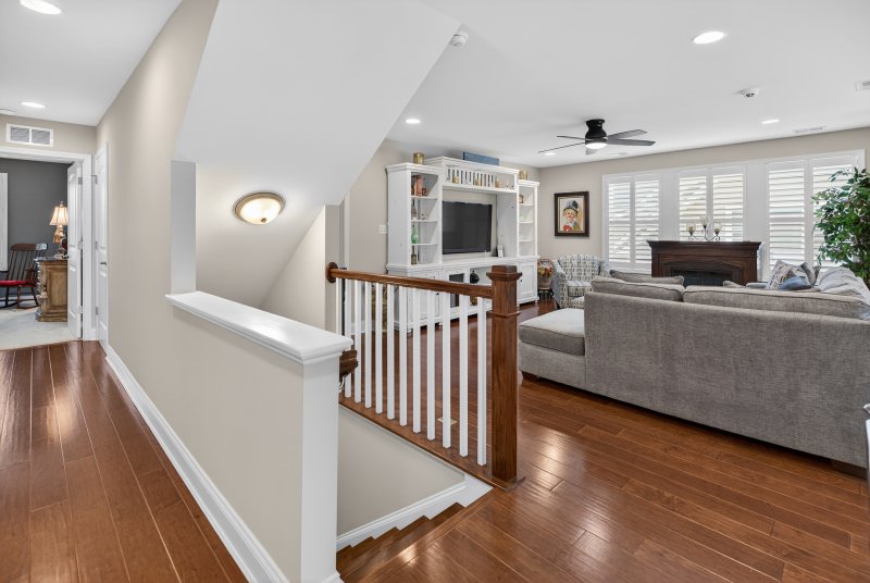 Manicured landscaping, a covered front porch, and classic board-and-batten shutters create an inviting exterior. Inside, a craftsman-style entry door with transom window opens to engineered 5-inch hardwood flooring that spans much of the main level. A designer color palette, Hunter Douglas plantation shutters, and a rare four-foot extension enhance the home’s spacious and airy layout. Coastal-inspired two-panel beaded arch doors add thoughtful architectural detail throughout.