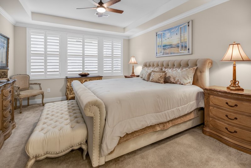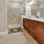The main-level primary suite offers a tranquil escape with a tray ceiling, dual walk-in closets, and a spa-inspired bath featuring a dual-sink solid wood vanity, custom tile flooring, and a beautifully tiled shower with bench seating and frameless glass door.