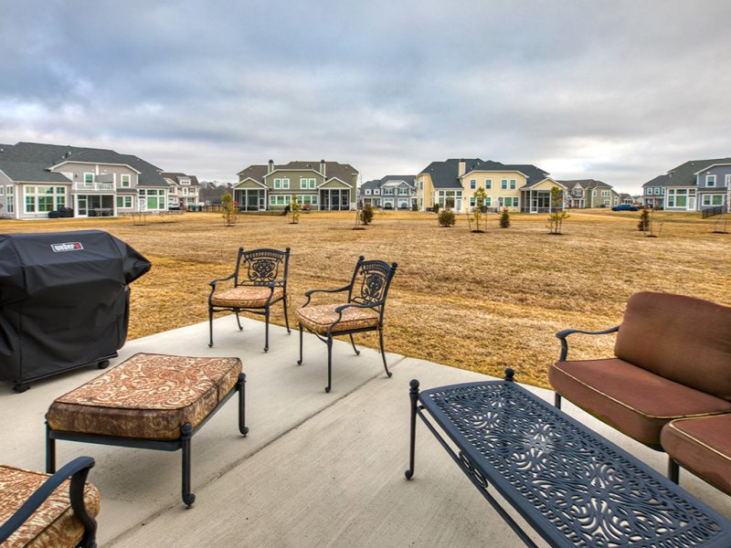 The adjoining dining area flows seamlessly into a bright living room with a vaulted ceiling, oversized picture windows, and a marble-surround gas fireplace. An atrium door with custom shutter leads to the extended rear patio—partially covered and outfitted with a ceiling fan and natural gas line for grilling—overlooking serene open space.