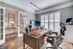 Step through the front door to find gleaming hardwood floors that flow throughout the main living level, offering the ease of largely single-level living. Just inside the entry, a versatile bedroom with French doors provides the perfect option for a home office, guest room, or flex space. The spacious living room features a coffered ceiling and a cozy gas fireplace with an elegant stone surround, creating a warm and refined gathering space.