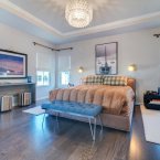 The primary suite is a private retreat, featuring a tray ceiling with chandelier, a spacious walk-in closet, and direct access to the covered porch. The ensuite bathroom is thoughtfully designed with dual vanities, ample cabinetry, a step-in shower with bench, and a private water closet, offering comfort and functionality in equal measure.