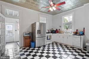 The spacious living and dining rooms are filled with natural light, providing the perfect setting for entertaining or quiet evenings. A formal dining room, accented by a vintage built-in china cabinet, flows into a large eat-in kitchen featuring black-and-white checkerboard tile, a stamped tin ceiling, and a window over the sink that invites the morning sun. A cozy sunroom just off the kitchen offers a peaceful space for reading or coffee breaks, while a powder room adds convenience on the main floor.