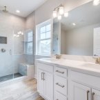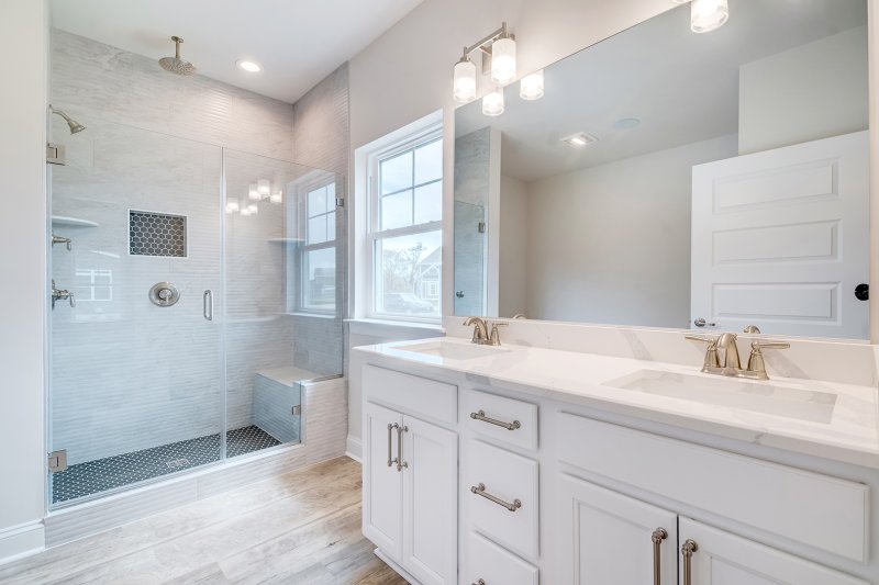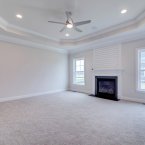 The main-level owner's suite is a retreat unto itself. A tray ceiling with built-in speakers, a cozy fireplace, and spacious walk-in closets set the stage for a space that feels as luxurious as it is livable. The spa-inspired ensuite bath — complete with a standalone soaking tub, a beautifully tiled glass-enclosed shower with bench seating, rain showerhead, and built-in niches — delivers the kind of finish you'd expect from a high-end boutique hotel.