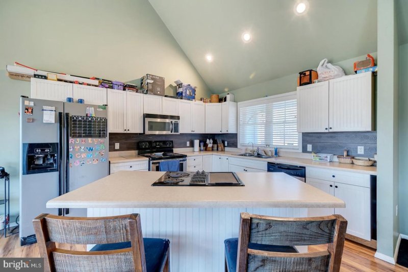 The open-concept kitchen is designed for everyday living and entertaining alike, showcasing beadboard cabinetry, stainless steel appliances, and a center island with an additional cooktop, storage, and seating.
