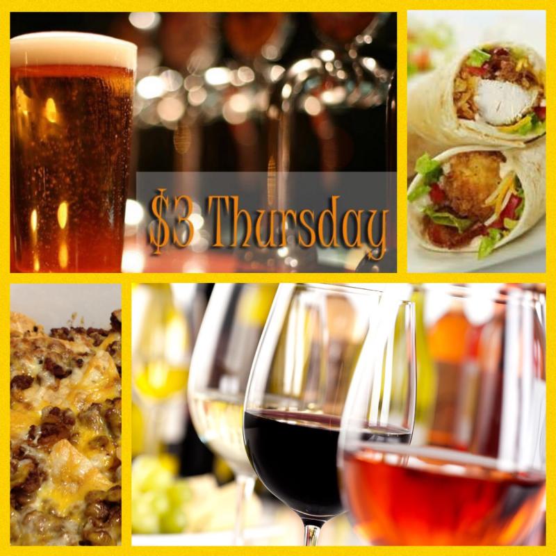 It's $3 Thursday in the house! Get domestic bottles, rail drinks and house wines for three bucks all day/night long!