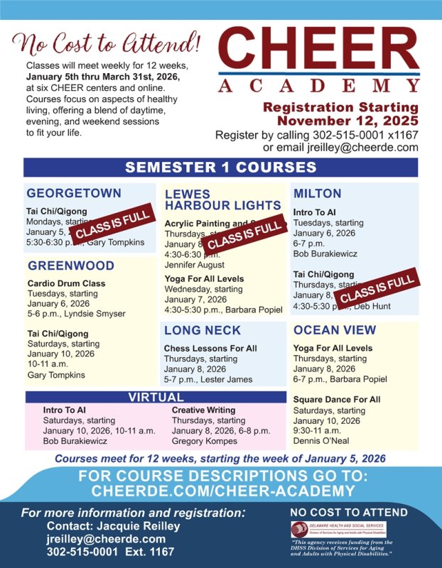 For course descriptions and to register just visit www.cheerde.com/cheer-academy. You can call 302-515-0001 ext. 1167 or email jreilley@cheerde.com.