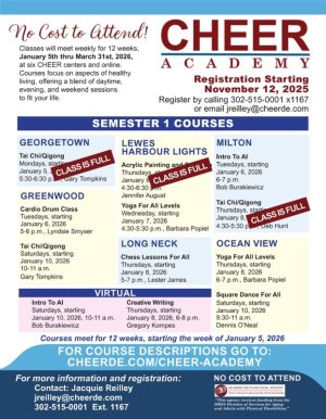 Classes run from January 5th thru March 31st at six CHEER centers and online. Focusing on aspects of healthy living and other blend of daytime, evening, and weekend sessions there is something here that will fit your lifestyle.