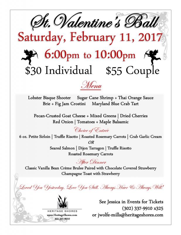Dancing to live music in the elegant Ballroom, enjoying a gourmet meal, delicious desserts and champagne... a perfect way to celebrate your love at the St.Valentine’s Ball at Heritage Shores. Make your reservations now for Saturday, February 11th from 6pm-10pm at Heritage Shores in Bridgeville, DE. Tickets: $30 for Individual or $55 per Couple. Contact Events at 302.337.9910 x325 or jwolfe-mills@heritageshores.com. www.HeritageShores.com
