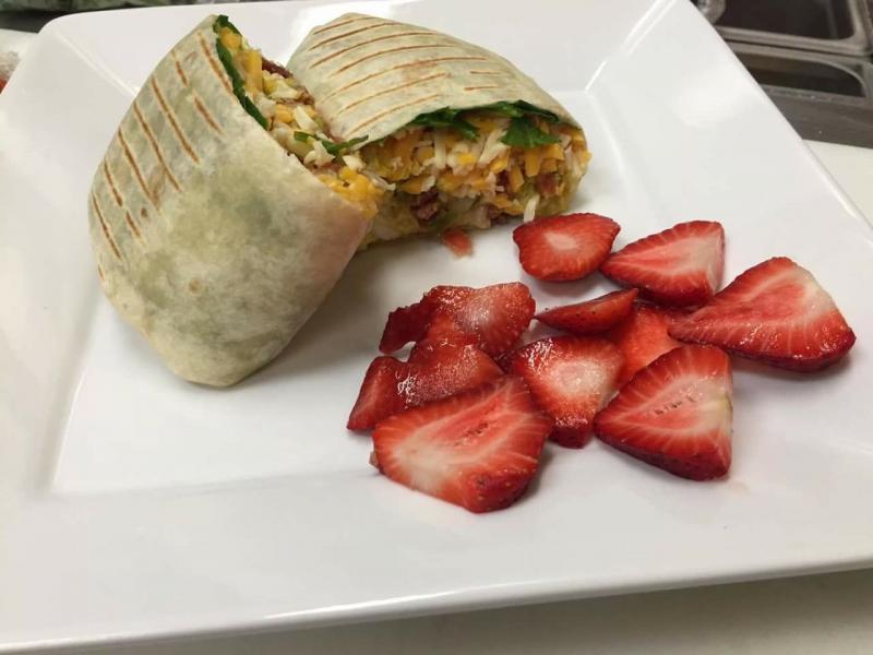 Breakfast Burrito has fresh baby spinach, guacamole, cheddar, pico de gallo, two scrambled eggs and your choice of: