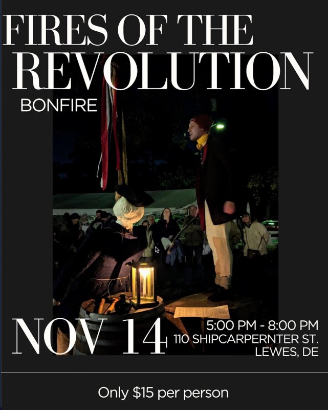 On Friday, November 14th, 2025, join us at the Historic Lewes Town Campus on Shipcarpenter Street from 5:00-8:00 for the return of a popular nighttime special event: Fires of the Revolution Bonfire Night!