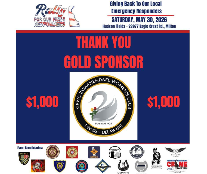 A huge THANK YOU to GFWC Zwaanendael Women's Club for their generous $1,000 Gold Sponsorship in support of the 5th Annual Rally For Our First Responders. As public spirited women serving and improving our community, we are extremely grateful for your support and your commitment to helping make a meaningful difference for Delaware’s first responders and their families.