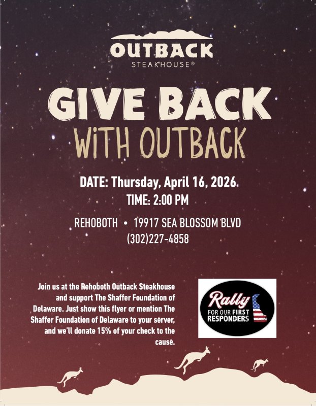 Join us for a Give Back Night with Outback Steakhouse (19917 Sea Blossom Boulevard, Rehoboth Beach, DE) and help support the 5th Annual Rally For Our First Responders!