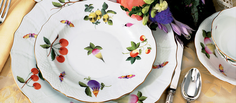 This unique pattern includes over 30 motifs that may appear in any combination, selected at the discretion of the artist. Introduced in the 1850s, Market Garden was often assigned to Herend's early Master Painters as a means of perfecting their skills. Handmade and handpainted porcelain from Hungary, enhanced with 24k gold. Assorted pieces available.