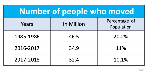 As we can see in the following table, the number of people who moved last year is half of what the rate was in the 1980s.