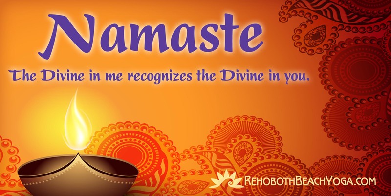 "This phrase is variously translated as 'The light in me greets the light in you' or "'The Divine in me recognizes the Divine in you.' This is the traditional, everyday greeting in India - with fingertips touching and hands held at the heart in Anjali Mudra. This expression is often used in yoga classes to begin or complete the practice, offering ones soul to the Divine."