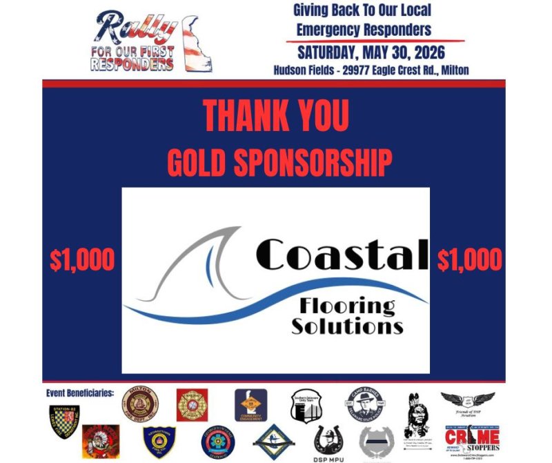 We would like to give a huge THANK YOU to Coastal Flooring Solutions, Inc. for joining the Sponsor Train with their generous $1,000 Gold Sponsorship supporting the 5th Annual Rally for Our First Responders. Your leadership and commitment help us continue making a meaningful impact for Delaware’s first responders and their families — and we are incredibly grateful for your support!