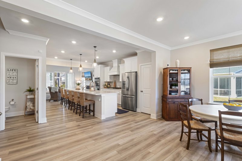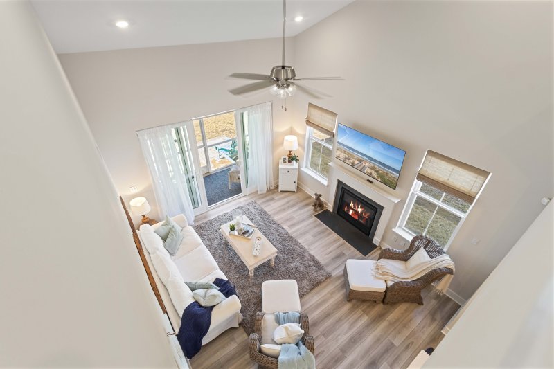 - Modern Finishes: Luxury vinyl plank (LVP) flooring, soaring vaulted ceilings, and a cozy fireplace anchor the main living space.