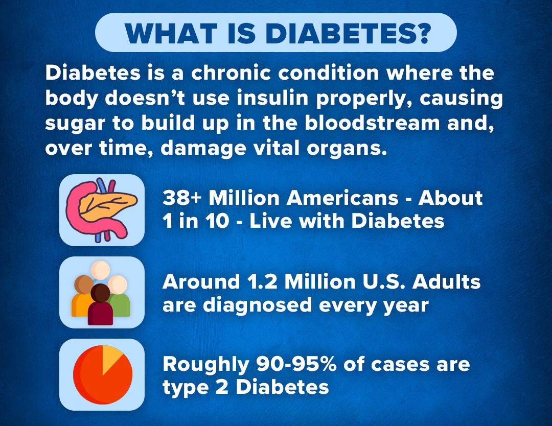 In the U.S., over 38 million people—about 1 in 10 Americans—are living with diabetes, and around 1.2 million adults are newly diagnosed each year. Most cases are diagnosed with type 2 diabetes, where the body still makes insulin but doesn’t use it well.
