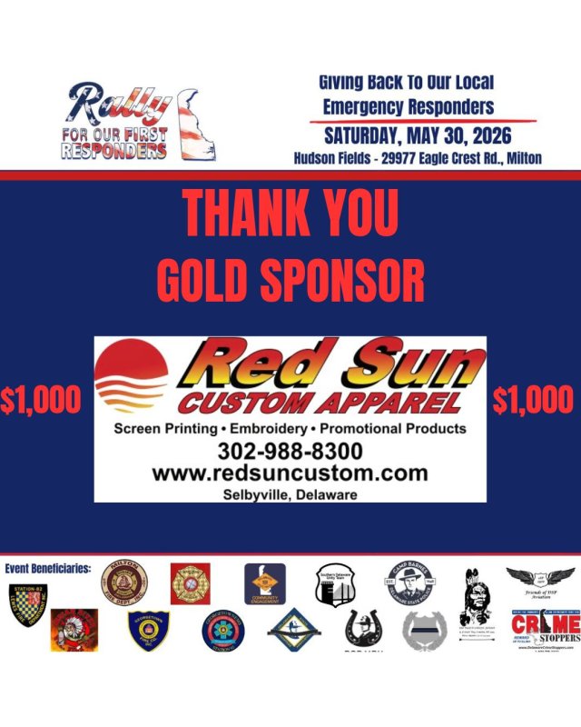 Red Sun Custom Apparel creates high-quality custom apparel and merchandise right in Selbyville, Delaware, offering screen printing, embroidery, DTF, and more — with nationwide shipping. Their support helps us continue our mission of supporting Delaware’s first responders and the departments that serve our communities every day.