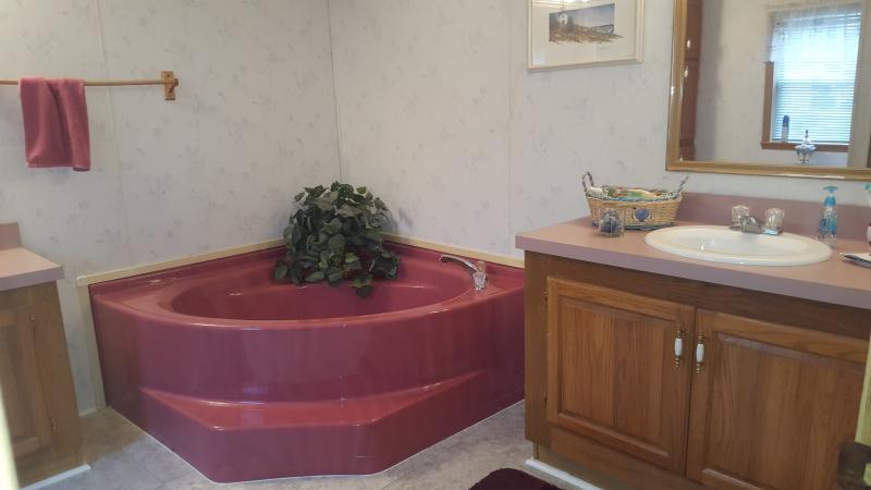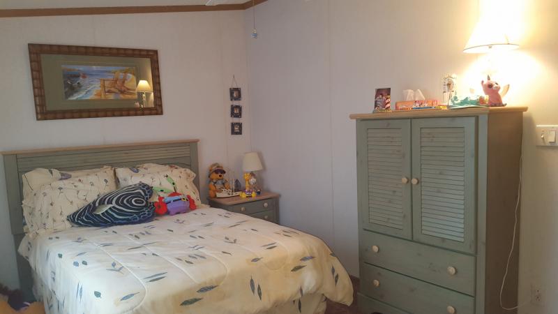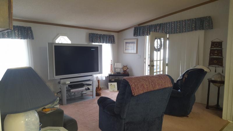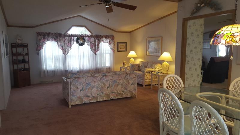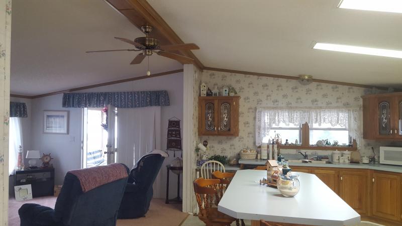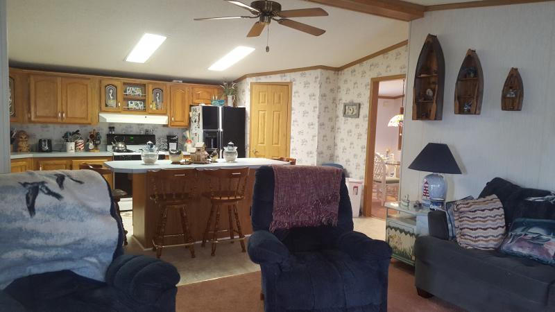 Spacious double wide with 2 living areas,3 bedrooms with great size closets 2 full baths. Master has separate tub, shower and 2 vanities. Eat in kitchen with large island open to the living area. All windows have blinds and curtains, 6 ceiling fans, Large screened in porch, new roof, new carpet and linoleum, Large landscaped lot. This home is a must see!