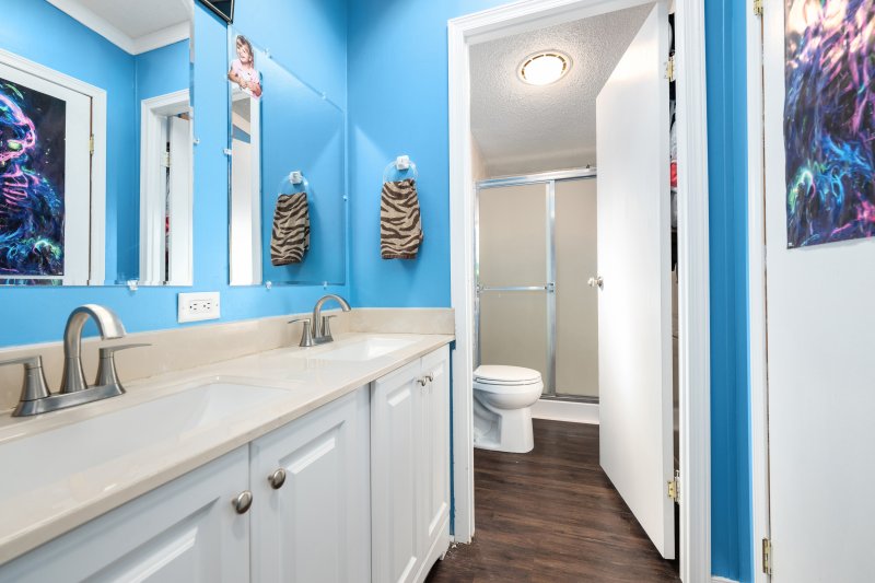 Inside, the layout features two spacious family rooms—one at the front of the home and one at the rear—providing flexible living and entertaining space. The primary suite includes a private bath with dual sinks and a walk-in closet, while two additional bedrooms offer ample closet space for family or guests. The rear family room and backyard overlook peaceful wooded views, creating a serene and private retreat.