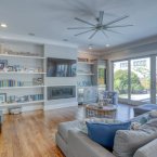 Inside, soaring 10-foot ceilings, rich oak floors, solid wood doors, and plantation shutters create a refined ambiance. The great room’s gas fireplace and custom built-ins connect seamlessly to a gourmet kitchen, featuring a Wolf six-burner range, Sub-Zero refrigerator/freezer, quartz counters, and a large island. Entertaining is effortless with a wet bar, wine fridge, whole-home audio, and central vacuum.