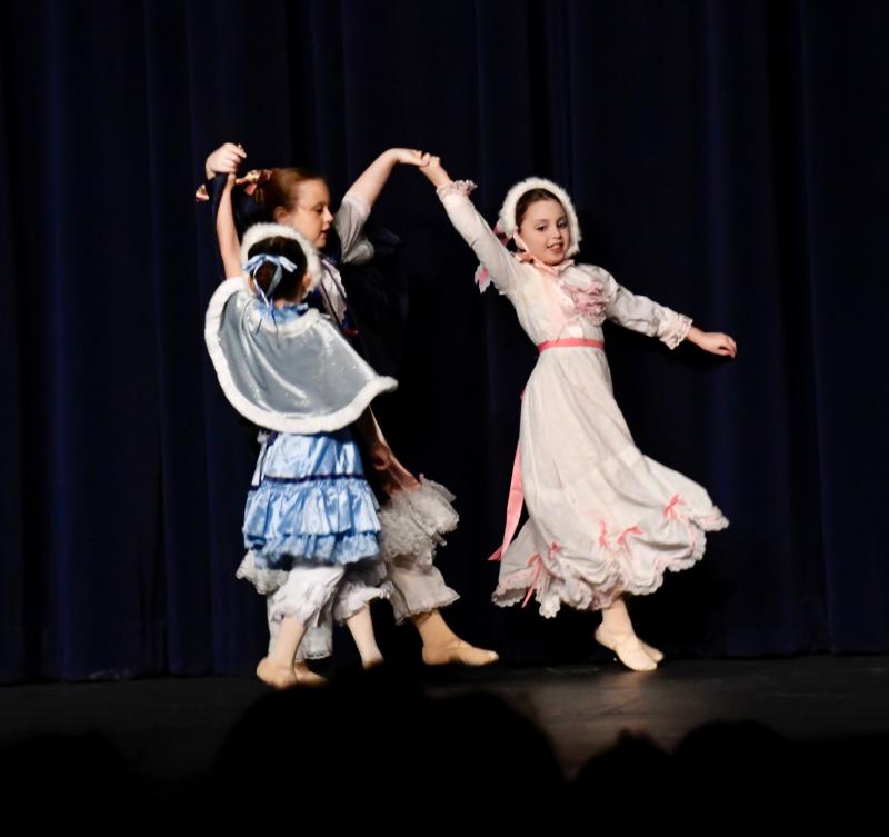 From left, young dancers Zelle Zimmer, Kinsey Volbrecht and Sofia Perniciaro prance across the stage during the opening of the “The Nutcracker.”