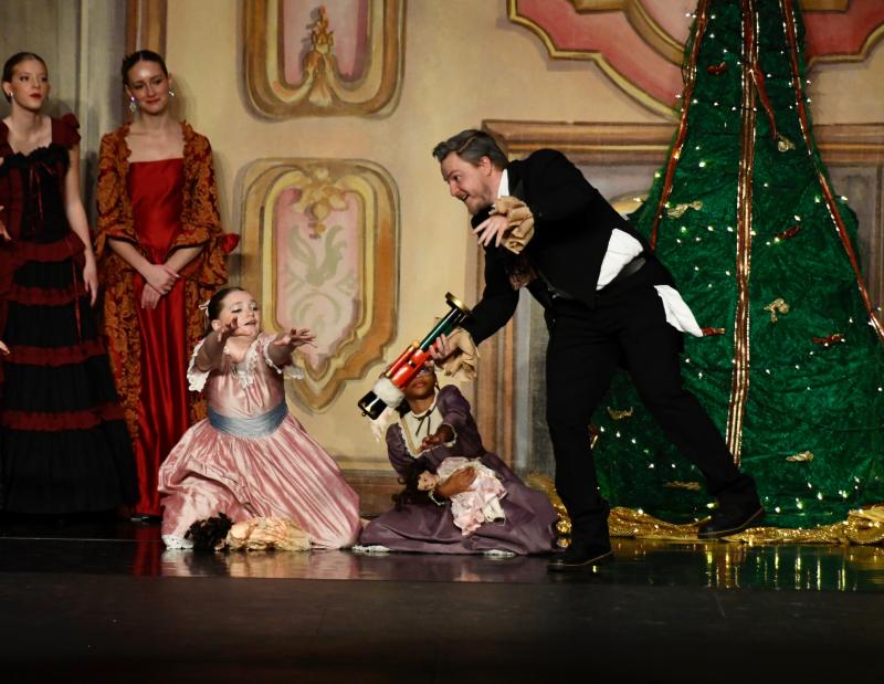 Herr Drosselmeyer, portrayed by Braden Swain, presents the special gift of a nutcracker to his god daughter Clara, portrayed by Lorilyn O’Day.