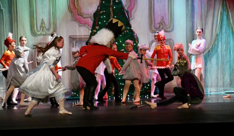 Claudia Walker, as The Nutcracker, leads her soldiers in a battle against the Mouse King, portrayed by Kimi Langoudi, and her legion of mice. The Nutcracker wins out.