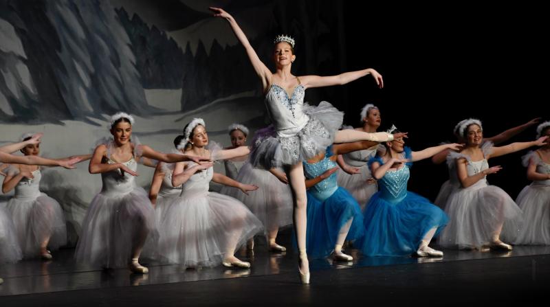 The Snow Queen portrayed by Olivia Conaway goes high up on her toes as she performs in the Land of Snow scene.