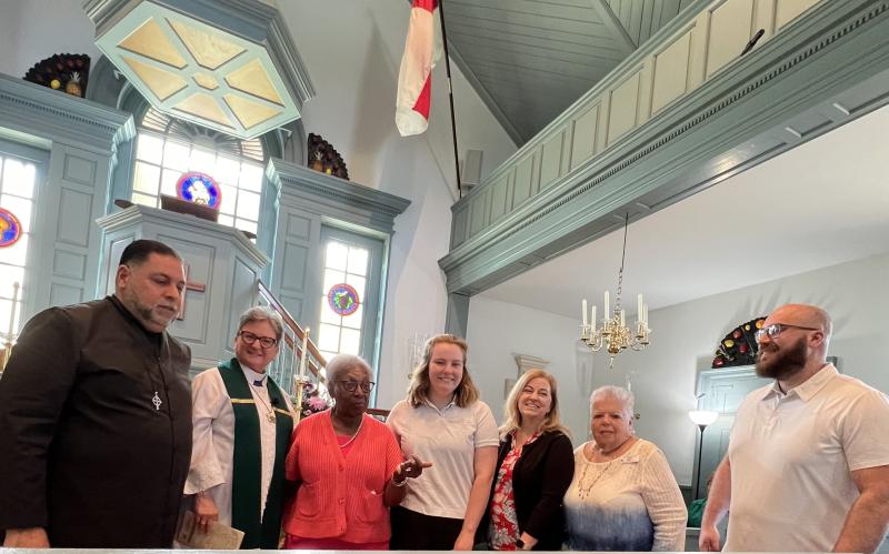 Gathered at St. George's Chapel for the scholarship presentation during the June 9 service are (l-r) Jon Rania, director of music and communications; the Rev. Judith Rhodes, priest associate; Joy Ann Murphy, ECW scholarship committee co-chair; recipient Hadyn Carter-Hanson; Sherry Taylor, ECW scholarship committee co-chair; Julie Baker, ECW president; and Chris Burkhart, Cape Henlopen High School music department chair and band director.