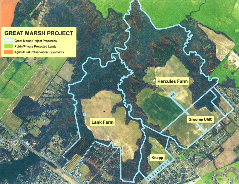 Efforts to preserve the four Great Marsh properties started even before the most recent 2014 negotiations began. The Hercules farm is named after the Hercules Powder Company, a Wilmington-based manufacturer of gunpowder and chemicals. The company owned several hundred acres of land along New Road and eventually sold land off to the University of Delaware and Sussex County. The county had planned to build a regional wastewater treatment plant on the site of the Hercules farm in the early 1990s, but after realizing the plant would be too far from the population it would serve, it sold the land to J.G. Townsend Jr. & Co. As part of the deal, the county acquired the land where the Wolfe Neck wastewater treatment facility now sits at the end of Wolfe Neck Road.