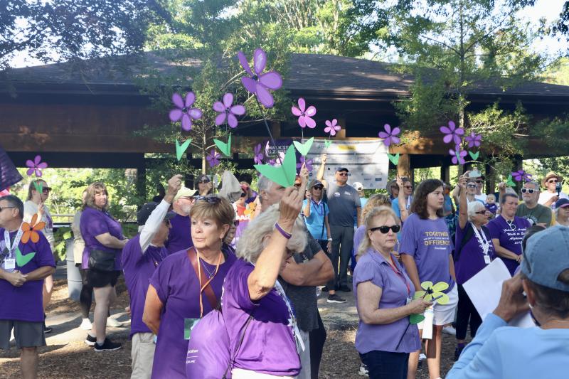 Walkers carried different color flowers representing how the disease has touched their lives: purple, for those who have lost someone to Alzheimer’s; yellow, for those caring for somebody with Alzheimer’s; blue, for those who are living with the disease; and orange, for those supporting the cause.