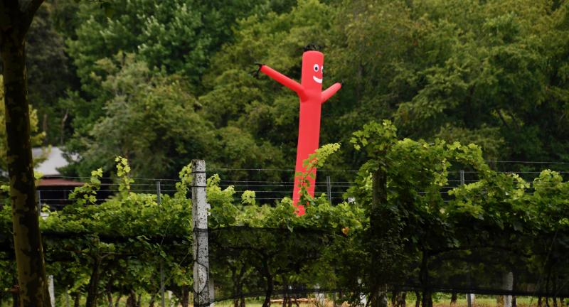 The vineyard’s arsenal includes netting, loud noises – including chirping birds – and a new addition, inflatable tube men gyrating in the breeze.