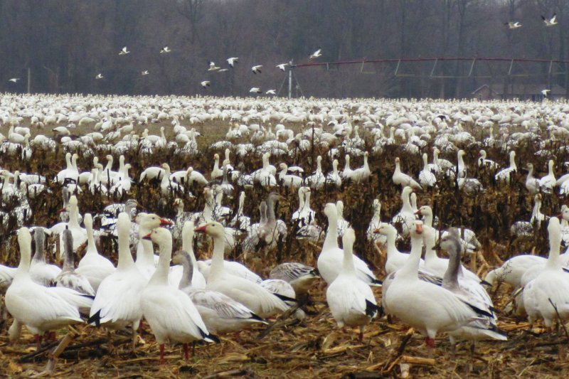Alerted by distant honking, look for a skein of birds strung out across the sky like a thread, an extended “V” of several hundred thousand snow geese (Chen caerulescens). Migrating flocks call out constantly during flight, and the team is able to quickly change direction by following a cue from leaders. Following the Atlantic flyway, these arctic nesters fly quickly at high altitudes and include frequent stops, called staging areas. A “blizzard” of snow geese creates a constellation of patterns against the sky before they descend on a cornfield to feed. Don’t miss the daily morning and afternoon flights over Sussex County this winter! Traveling high in the sky, these small white geese have black wing tips.