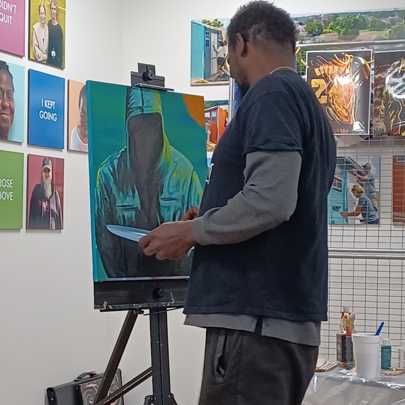 A Delaware artist, Walls honed his creative voice during his years of confinement in the James T. Vaughn Correctional Center near Smyrna. He talked about his life and art with Pallet Village residents while painting a new version of his signature piece, “Weathering the Storm,” which he first created while he was incarcerated at the State Correctional Institution - Phoenix in Pennsylvania during a temporary transfer.