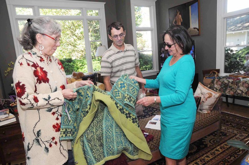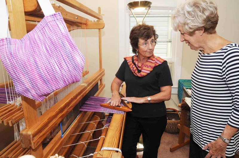 Handweaver and fiber artist Perry Drevo explains the operation of her loom to Betsy Hansot. BY STEVEN BILLUPS