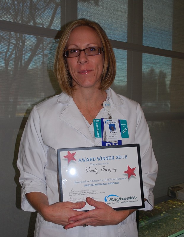 Bayhealth Certified Wound Ostomy Care Nurse Wendy Surguy, BSN, RN, CWOCN, of Felton was named 2012 Heath Educator of the Year for Bayhealth Milford Memorial. She received the Carol Soots Award, named for a longtime Emergency Department nurse at Milford Memorial who passed away.