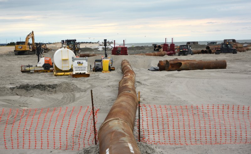 The beach sand causes the tracks to make a high-pitched whine, but excavators in the construction zone can delicately move the 40-foot-long, 2-ton pipes into a specific location so they can be connected to extend the replenishment area.